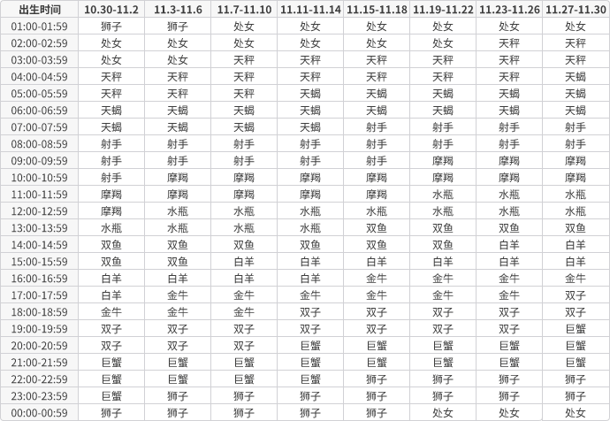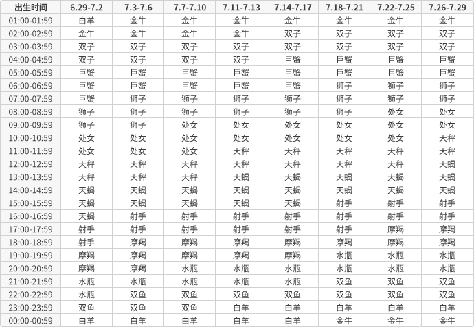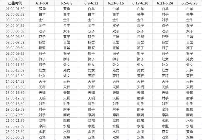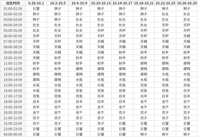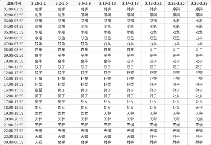 上升星座速查表,根据出生日期查询。上升星座受出生日期和出生地共同影响,更准确的上升星座查询请使用上方的专业上升星座查询工具。