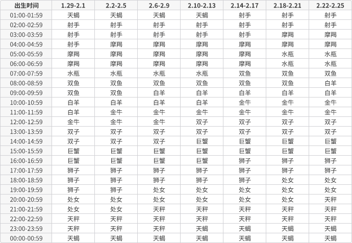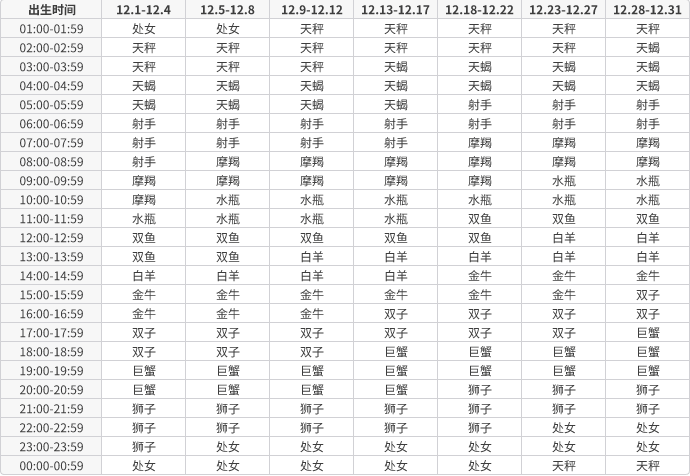 < 1月出生的十二星座上升星座查询表 >