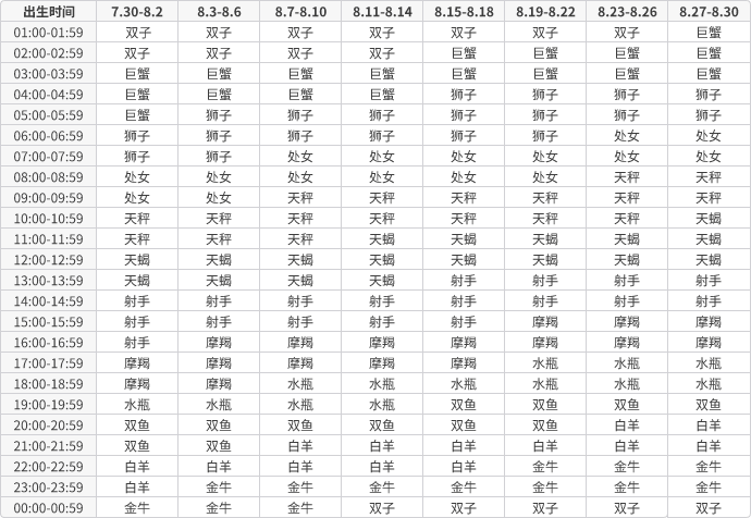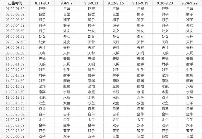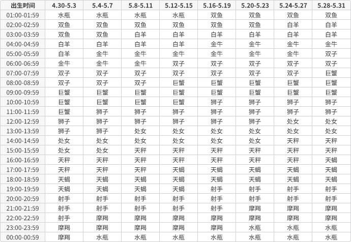 上升星座查询表
